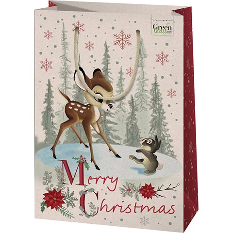 Bambi a mai napig az egyik legszebb és legmegindítóbb Disney mese, így ez a karácsonyi hangulatú, a kis őzikével díszített ajándéktáska remek választás a gyerekek számára. Kellemes illatú, kaszált fűből készült ajándéktasakok a környezettudatos csomagolás új generációját képviselik. A fű cellulóztartalma miatt a papír előállításához nincs szükség fák kivágására A nagy méretű, álló kialakítású ajándéktáska kiváló minőségű, telített színekkel készített nyomata szép megjelenést, míg a lakkozott vastag papír és az erős zsinórfüles kialakítás tartósságot kölcsönöz neki, hogy a benne lévő ajándékok biztonságban legyenek.