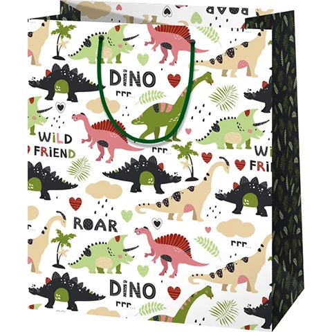 A dinoszauruszokat nagyon szeretik a gyerekek, ami nem meglepő, hiszen ezek a különleges lények egy régi és varázslatos világot idéznek, éppen ezért remek választás ez az ajándéktasak, amin mindenféle dinó megfigyelhető. A közepes méretű, álló kialakítású ajándéktáska kiváló minőségű, telített színekkel készített nyomata szép megjelenést, míg a vastag papír és az erős zsinórfüles kialakítás tartósságot kölcsönöz neki, hogy a benne lévő ajándékok biztonságban legyenek.