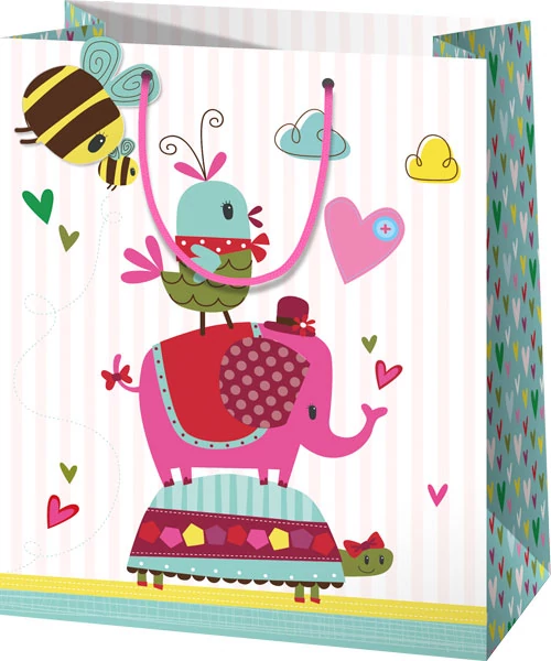 Könnyen megúszhatjuk a csomagolást, ha ebbe a vagány és vidám elefántos mintával ellátott ajándéktasakba rejtjük el az ajándékainkat. A közepes méretű, álló kialakítású ajándéktáska kiváló minőségű, telített színekkel készített nyomata szép megjelenést, míg a lakkozott vastag papír és az erős zsinórfüles kialakítás tartósságot kölcsönöz neki, hogy a benne lévő ajándékok biztonságban legyenek.