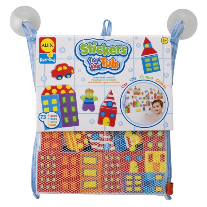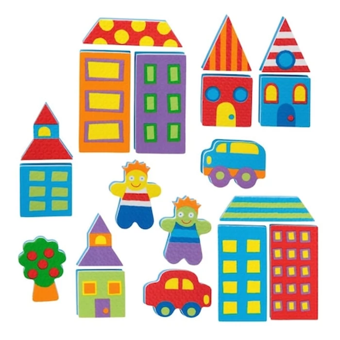 A habszivacs elemekből egy egész várost össze lehet állítani fürdés közben. A készlet elemei könnyen tapadnak csempére vagy a kád falára és játékosan lebegnek a víz felszínén is. A termékhez tapadókorongos tároló zsák is tartozik, hogy könnyebb legyen a szárítás és a tárolás. Ftalátmentes kivitel.