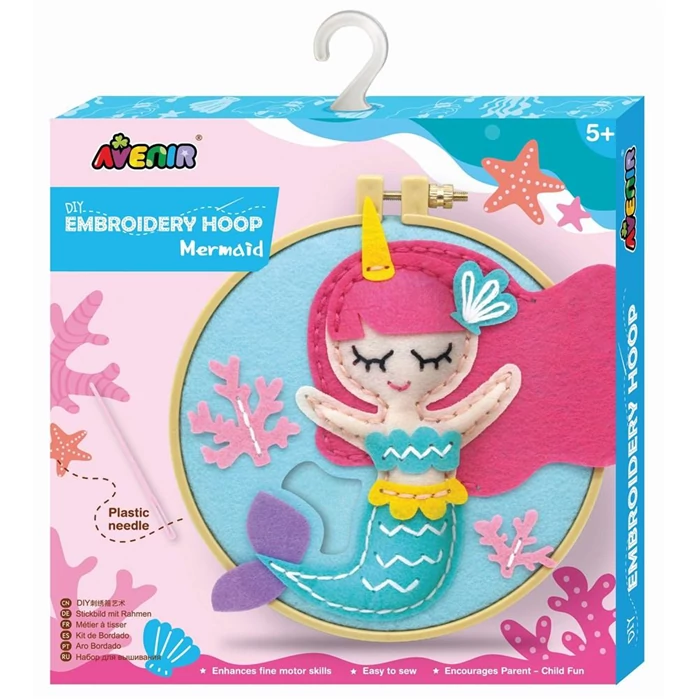 Készíts egy meseszép sellős hímzett képet a szobádba vagy ajándékba a dobozban található eszközök segítségével! A készlet tartalma egy 16 cm átmérőjű hímző ráma, előre perforált filc anyagok, műanyag hímzőtű, színes fonalak.
