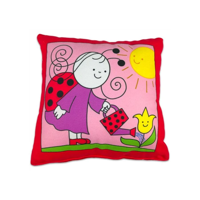 Helyezd magad kényelembe a Bogyó és Babóca mesefilmből megismert katicáról, Babócáról mintázott díszpárnával! A párna elején kedvenc mesehősöd láthatod, miközben megöntözi virágát. A párna felületi mosással tisztítható, mosógépbe nem rakható.