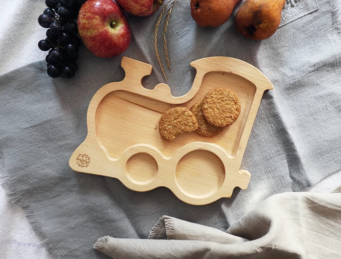 Borbolya fa tányér gőzöletlen bükkfából, vonat alakú.