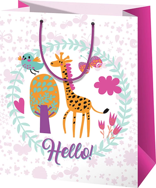 Az ajándéktáska zsiráffal, fával, pillangóval, madárkával és egy 'Hello' felirattal díszítve.