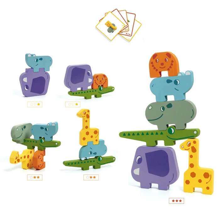 Hívókártyák tartalmazzák a játszó gyermek számára az építési kihívásokat. Szinte serkenti a gyermeket a meghökkentő, kreatív építési megoldásokra. Az állatfigurás építőelemek sorrendisége lehet, hogy a nagyságuk és a formájuk által behatárolt, mégis a gyermekek elgondolásai lehetnek nagyon egyediek. Ennek a kivitelezésnek is módot ad a Tehetős építőjáték. Ez a játék 3 éves kortól - vagy hamarább is - ajánlott, bizonyos, hogy ez az a játék, ami sohasem kerül ki a gyermekszobából, mert ez egy logikai, gondolkodtató, kísérletezéseket megengedő különleges játék, minden korosztálynak megfelelő. A készlet tartalmaz hatféle állatfigurát: elefántot, zsiráfot, oroszlánt, vízilovat, orrszarvút és krokodilt.
