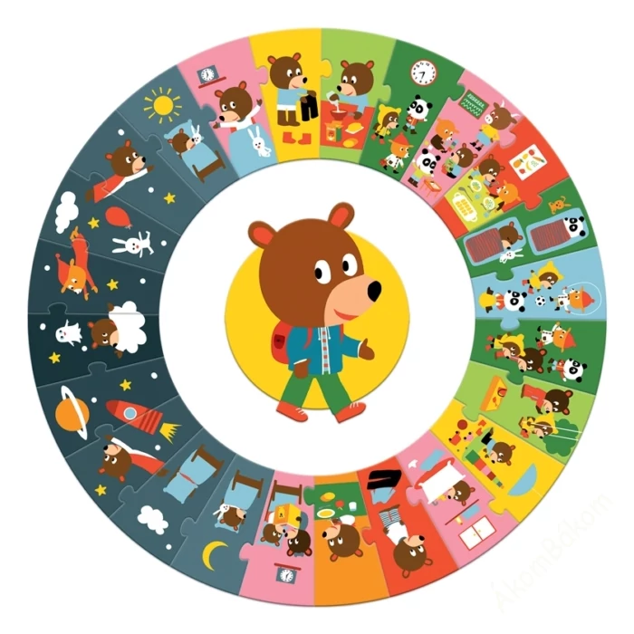 Kedves mackó mutatja be mikor kelnek, mikor alszanak, közben mivel foglalkoznak a gyerekek. Koncentrációt, megfigyelést igénylő kirakó