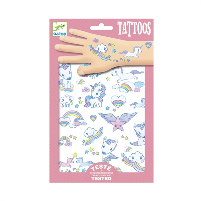 A Djeco tetováló matricák bevizezés nélkül, azonnal felragadnak a bőrre!