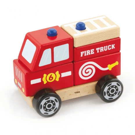 Kiváló minőségű és valósághű festésű nagy tűzoltóautó építhető össze részeiből. A különböző darabokat az autó alapján elhelyezett farudakra kell helyezni helyes sorrendben. A szétszedhető és összerakható kisautó fejleszti a szem-kéz koordinációt és logikus gondolkodásra serkent.