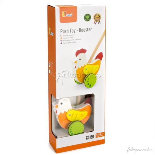 Tologatós kakas díszdobozban Alapanyag: fa Méret: 15 x 8 x 17 cm Doboz mérete: 18,2 x 8,5 x 50 cm Nyél hossza: 46 cm 1 éves kortól ajánlott.