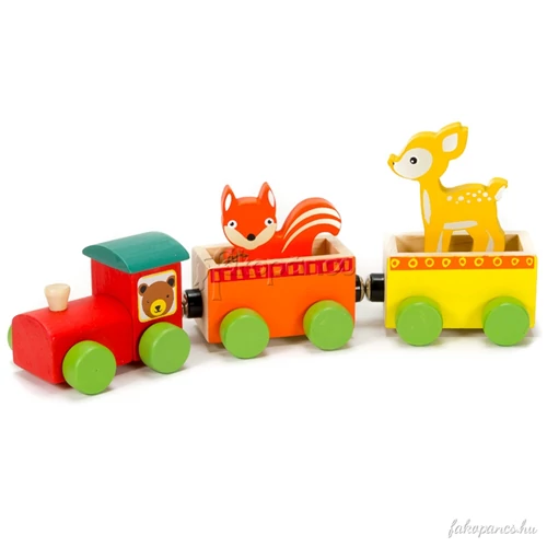 A színes kis tologatható favonat mozdonyában mackó úr ül, pöfögve zakatol a rakománnyal a kis vonat: őzike és mókuska utazik éppen. A vagonok mágnessel csatlakoznak egymáshoz. Régi idők játéka, a hagyományos fa játékvonat nem hiányozhat gyermekeink polcáról sem.