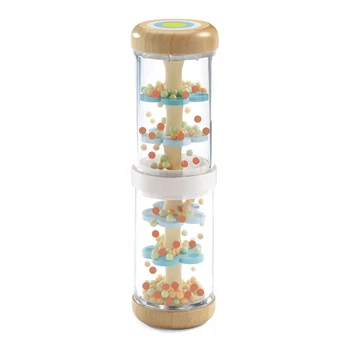 A kis színes golyócskák a homokóra elven tervezett csörgőben olyan hangot adnak, mintha csendes eső esne.