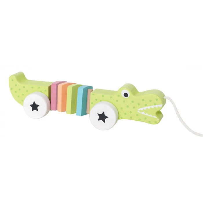 A kicsik szeretnek a ház körül sétálni, ahová magukkal vihetik új barátjukat. A krokodil boldogan kíséri gyermekét minden izgalmas kalandon. A húzható játék erős, fából készült kerekekkel rendelkezik, amelyek megkönnyítik a mozgását.