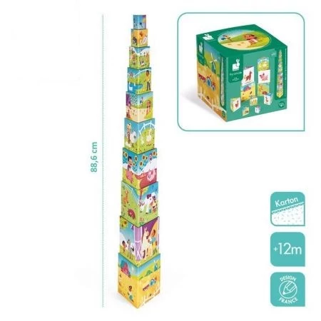 Piramis torony A francia Janod márkától .10 darab háromszög alakú építő kockából áll, amelyek a legjobb minőségű kartonból készülnek.