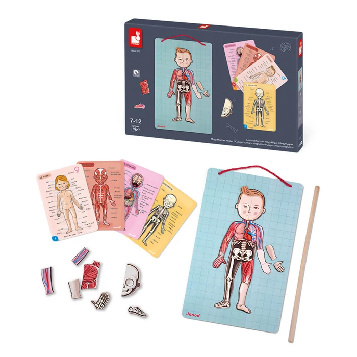 Most már MAGYAR nyelvű kártyákkal! Fedezd fel az emberi testet! A kis tudósok könnyen megtanulhatják az emberi test részeit erről a mágneses kártya puzzle-ról. Mind a külső, mind a belső szervek fel vannak tüntetve, sőt tíz különböző nyelven köztük MAGYAR, angol, francia, német, holland, spanyol, olasz, orosz, dán és japán nyelveken. Ezeket a különböző testfelületeket kell a gyerekeknek egymásra helyezniük. Ez a készség-, és memóriafokozó játék kiváló biológiai előtanulmány és szórakozás is egyben.