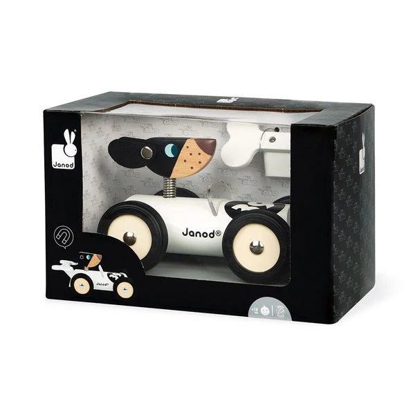 Ez az autó alakú aktív játék ideális a gyermekek motorikus készségeinek fejlesztésére. Ez a gyönyörű, lakkozott festésű faautó kutyafejjel gumikerekekkel van felszerelve, hogy csendesen guruljon.
