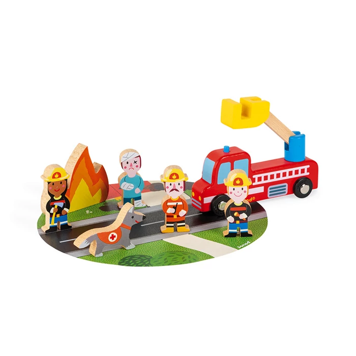 A szett 7 fa darabot tartalmaz: 3 tűzoltó, 1 sérült, 1 mentőkutya, 1 láng, 1 teherautó.