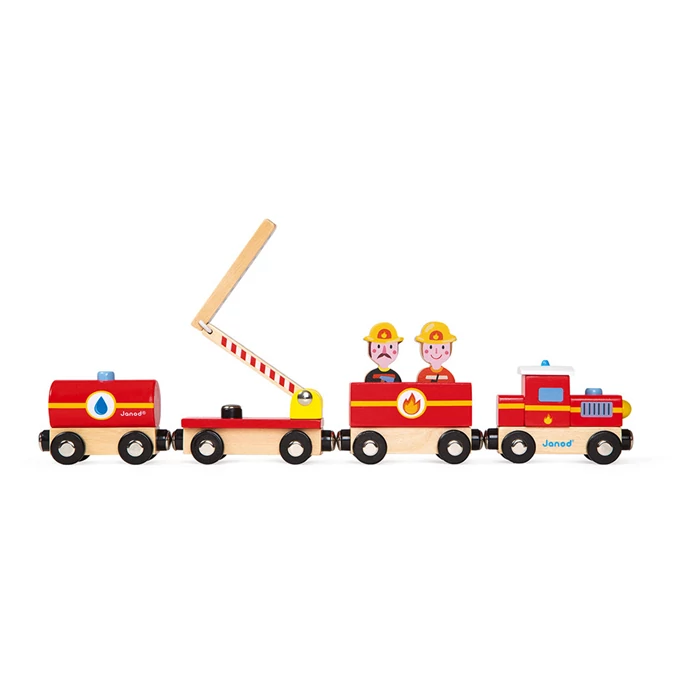 Ez a fából készült tűzvonat 4 mágneses vagonból és 2 tűzoltóból áll.