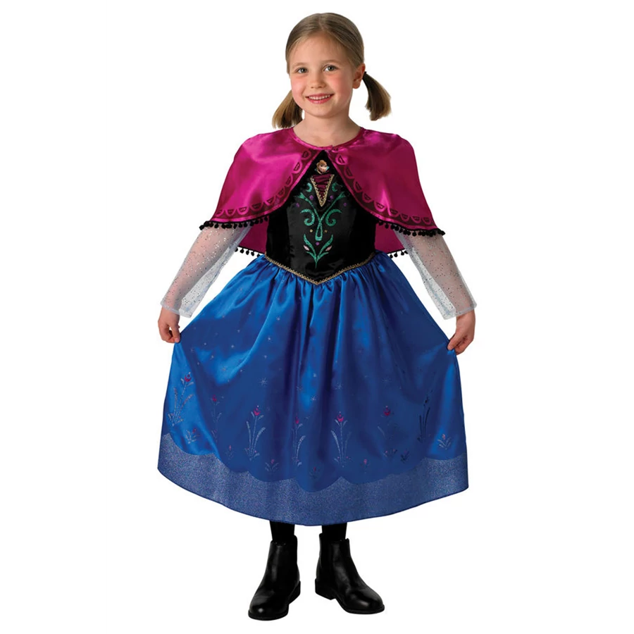 A csomagban megtalálható egy gyönyörűen hímzett, Jégvarázs motívumokkal díszített sötétkék színű Anna hercegnő ruha a hozzá tartozó fényes bordó palásttal.