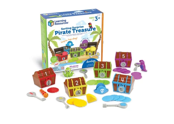 A ládikák nyitogatása és zárása kiválóan fejleszti a kézügyességet (finommotorikát), míg a kincsekkel való játék remekül támogatja a színfelismerést, és a számolással való ismerkedést.