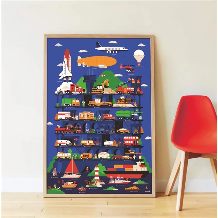 Ezzel a nagy poszterrel, az áthelyezhető matricákon keresztül a gyerekek felfedezik a legmenőbb járműveket. A nagyon szép matricák felragasztásához a gyermeknek meg kell figyelnie, össze kell hasonlítania, így fog könnyedén tanulni. Gyönyörűen díszít majd egy nappali vagy egy családi szobát is.