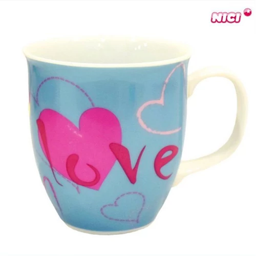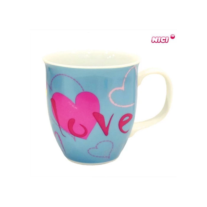 Nyugalmas reggeleken és békés estéken a forró tea és meleg kakaó kortyolgatásához remek eszközöd lehet ez a kék színű szívecskés, love feliratú bögre.