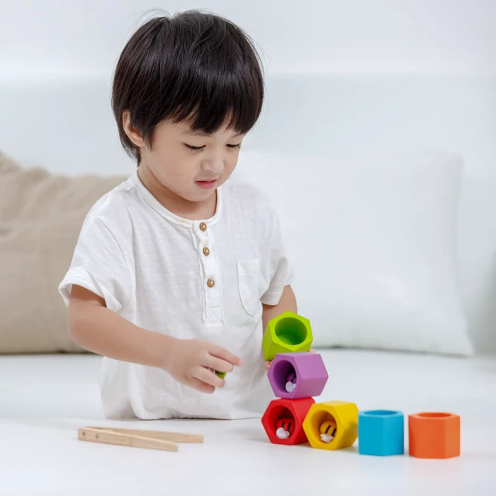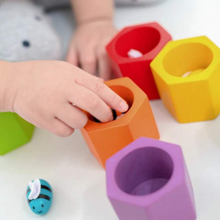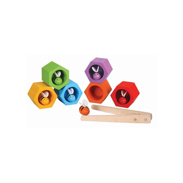 Sikerül minden méhecskét a helyére tenni? PlanToys – méhkasok öko fejlesztő fajáték, ami fejleszti a szem kéz koordinációt, a színfelismerést, megtanítja a csipeszelő mozdulatot, fejleszti a finom motorikát, a probléma megoldó készséget. Fejleszti a színfelismerést és tanítja a számolást is.