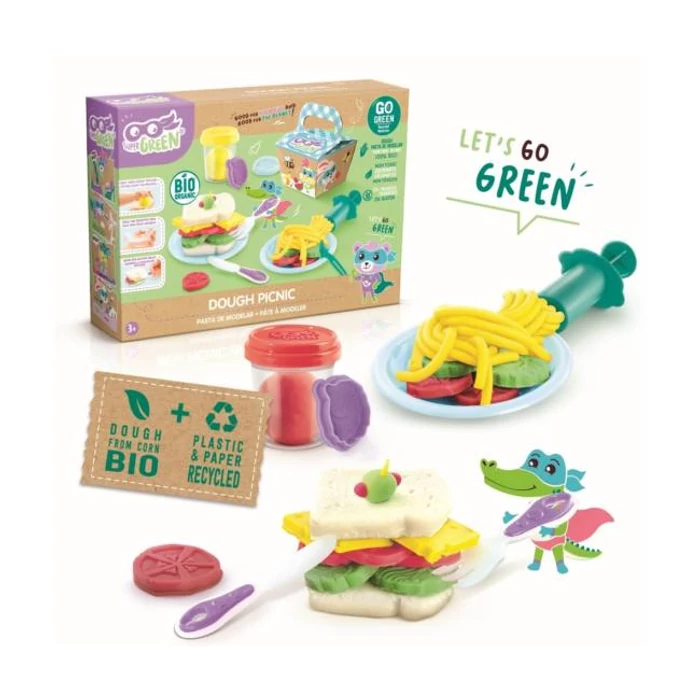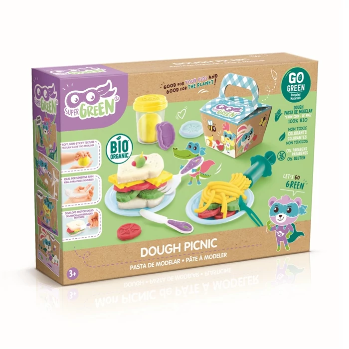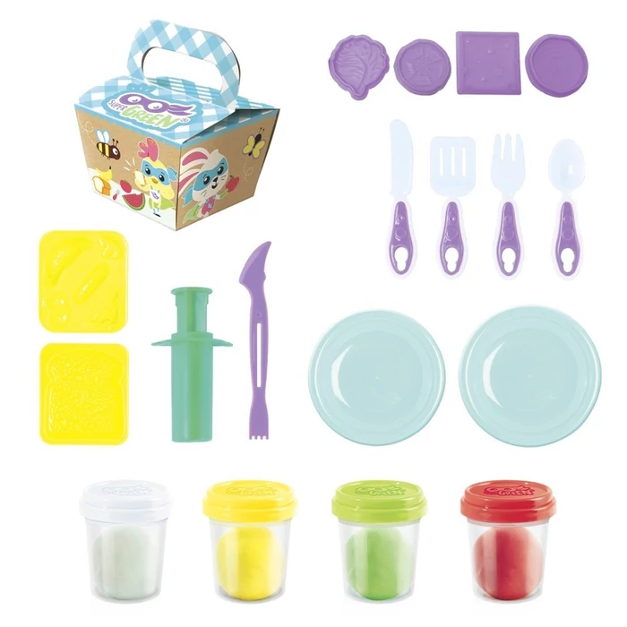 A Super Green Gyurma piknik egy ötletes 8 darabos szett, amivel különféle ételeket, szendvicseket készíthetnek az ügyes gyermekkezek, és mindezt egy papírdobozba is bepakolhatják, amivel piknikre indulhatnak. A gyurmázás örömmel töltik el az apróságokat és segítik őket kreativitásuk, motoros készségeik fejlesztésében. A szett tartalma: