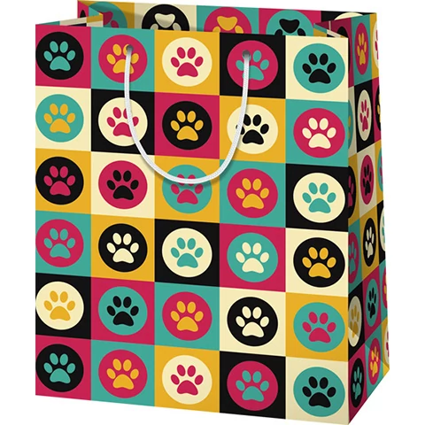 A legtöbb ember szereti a kisállatokat, és ha az ő számukra akarunk ajándékot adni, akkor keresve sem találnánk jobb tasakot az ajándékok számára, mint ezt a vidám színekkel és tappancsos mintával ellátott darabot. A közepes méretű, álló kialakítású ajándéktáska kiváló minőségű, telített színekkel készített nyomata szép megjelenést, míg a lakkozott vastag papír és az erős zsinórfüles kialakítás tartósságot kölcsönöz neki, hogy a benne lévő ajándékok biztonságban legyenek.