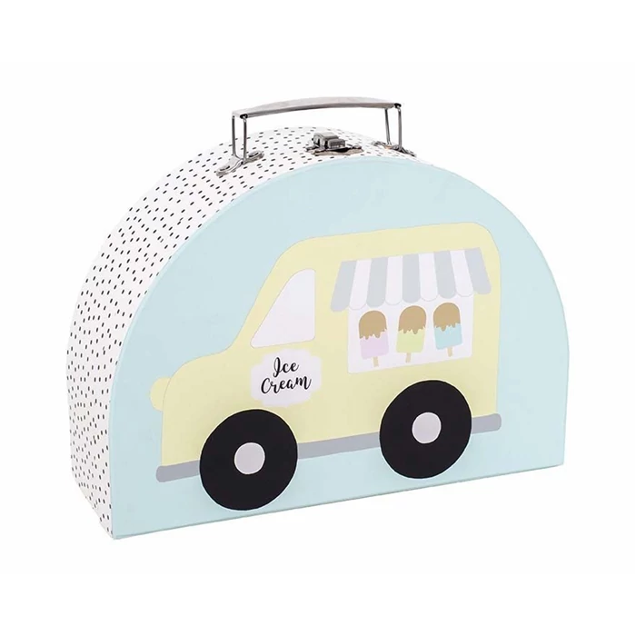 A kisbőrönd az oldalán fagylaltkocsis és fagylaltos illusztrációkkal díszített. A tároló bőrönd erős kartonból készült, elegáns ezüst hordozófogantyúval és fém kapcsokkal ellátva.